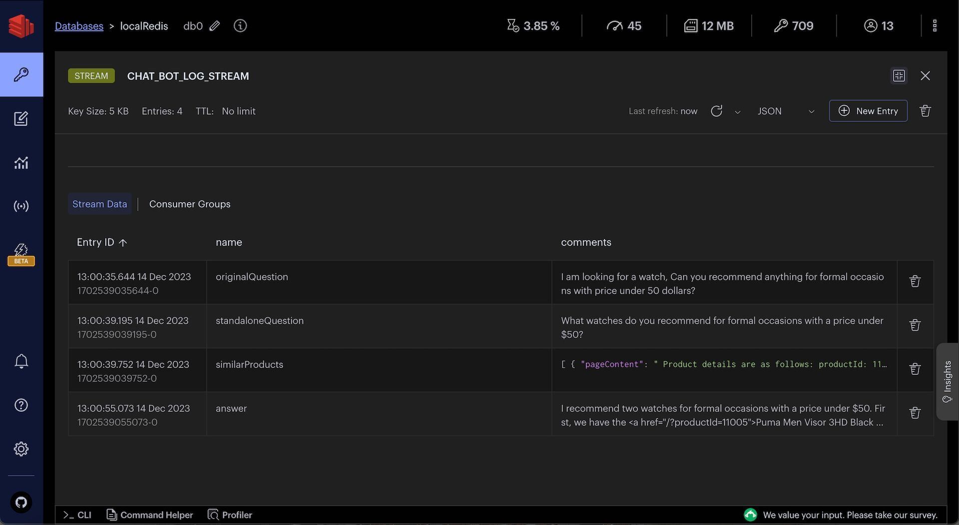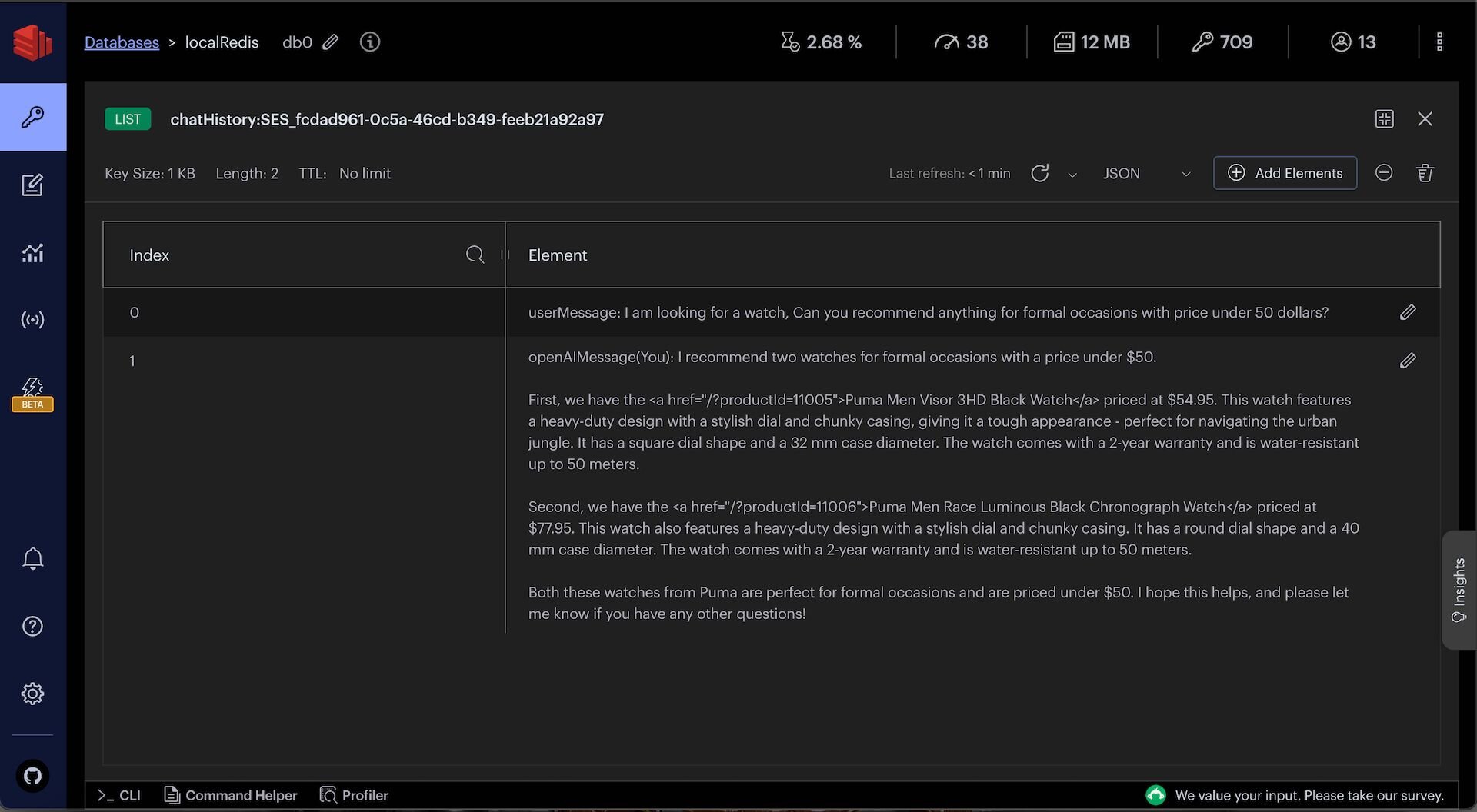 openAI to convert the standaloneQuestion, similar products from Redis and other context to a human understandable answer.You can observe chat history and intermediate chat logs in Redis Insight: