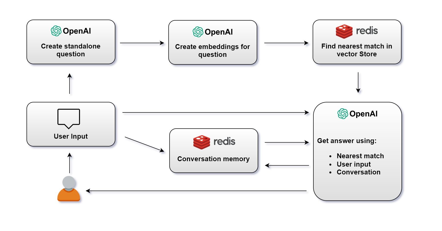 Redis vector store. The system searches for the nearest match to the question embedding among stored vectors4> Get Answer: With the user initial question, the nearest match from the vector store, and the conversation memory,
